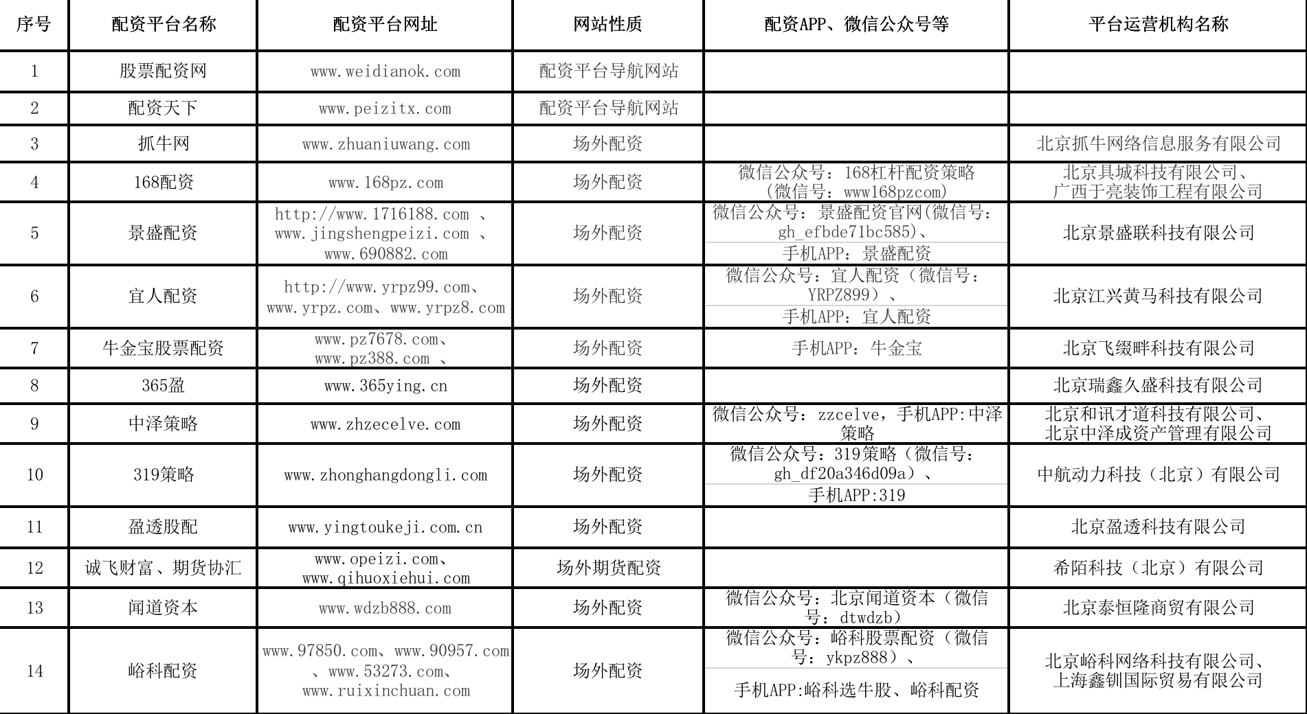 北京证监局官网公示下列场外配资平台存在极高风险,其运营机构不属我局监管对象,请广大投资者提高警惕,远离场外配资,避免财产损失。
